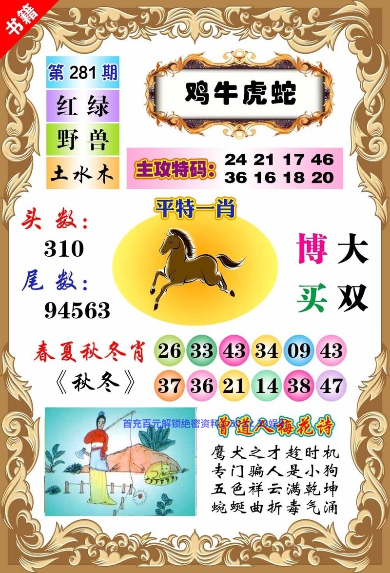 276期曾道人梅花诗:今期特码转开单,单是龙猪加马蛇,猴兔万财鸡又来,特是蓝绿金水开